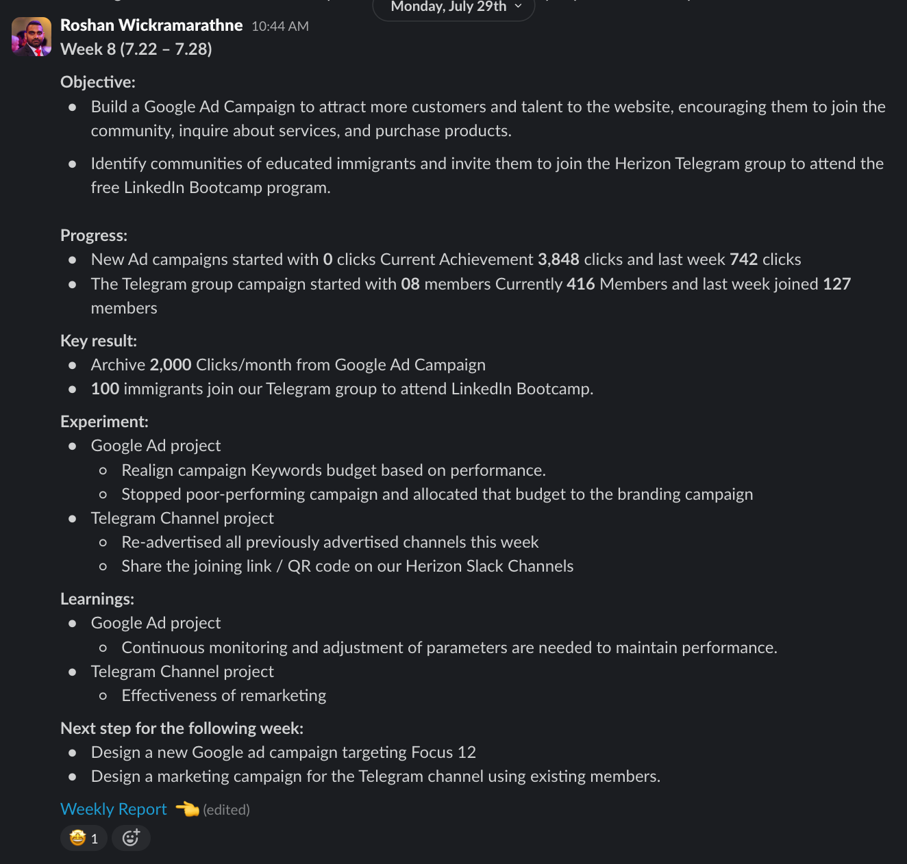 Roshan has been assigned the project of enrolling 100 immigrants into Herizon’s Telegram channel, a social media channel Herizon uses to promote free monthly LinkedIn Bootcamp for job seekers, and here are Roshan’s thoughts on his collaboration with Herizon over the past two months.