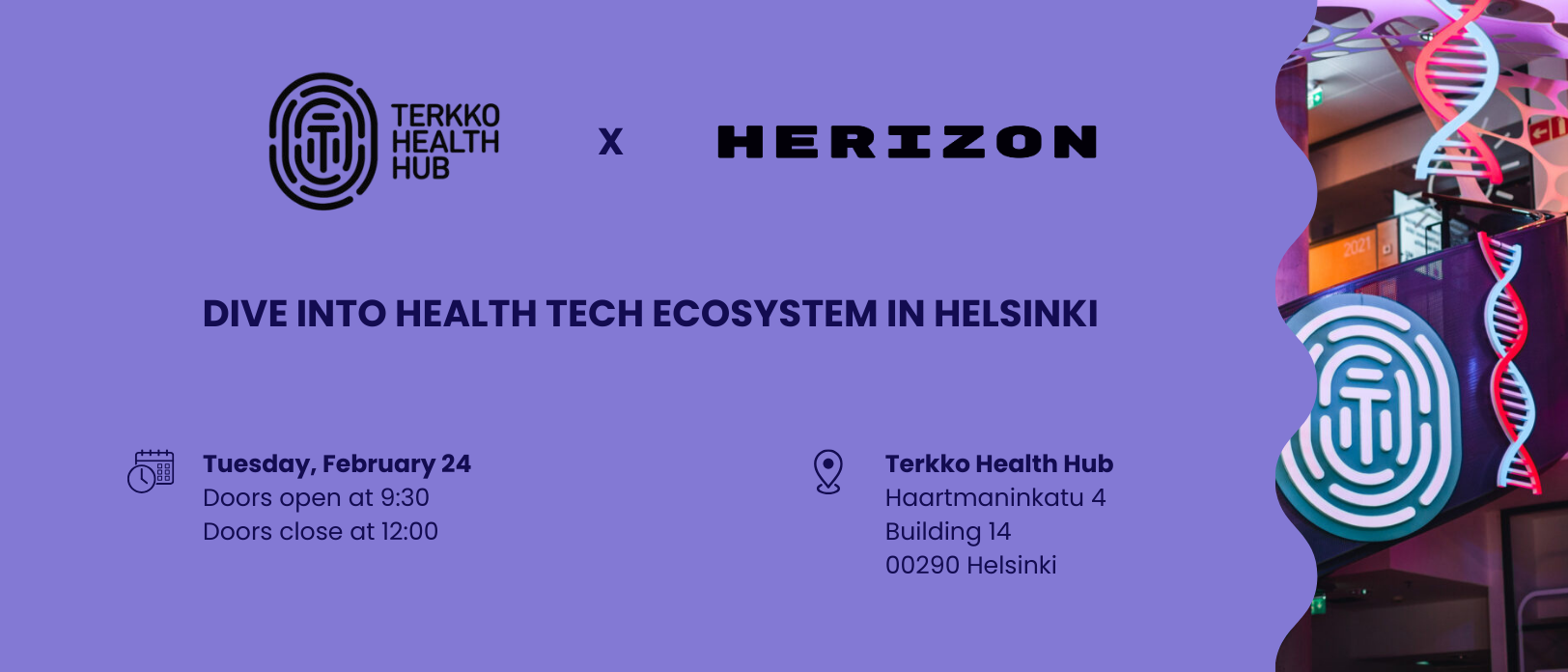 Join us at Terkko Health Hub for a morning visit, where we get to know the home of health and life science innovation in Helsinki and have a chance to take a peek behind the everyday of a Health Tech company through a panel conversation with a founder and employee or two companies based in Terkko Health Hub.