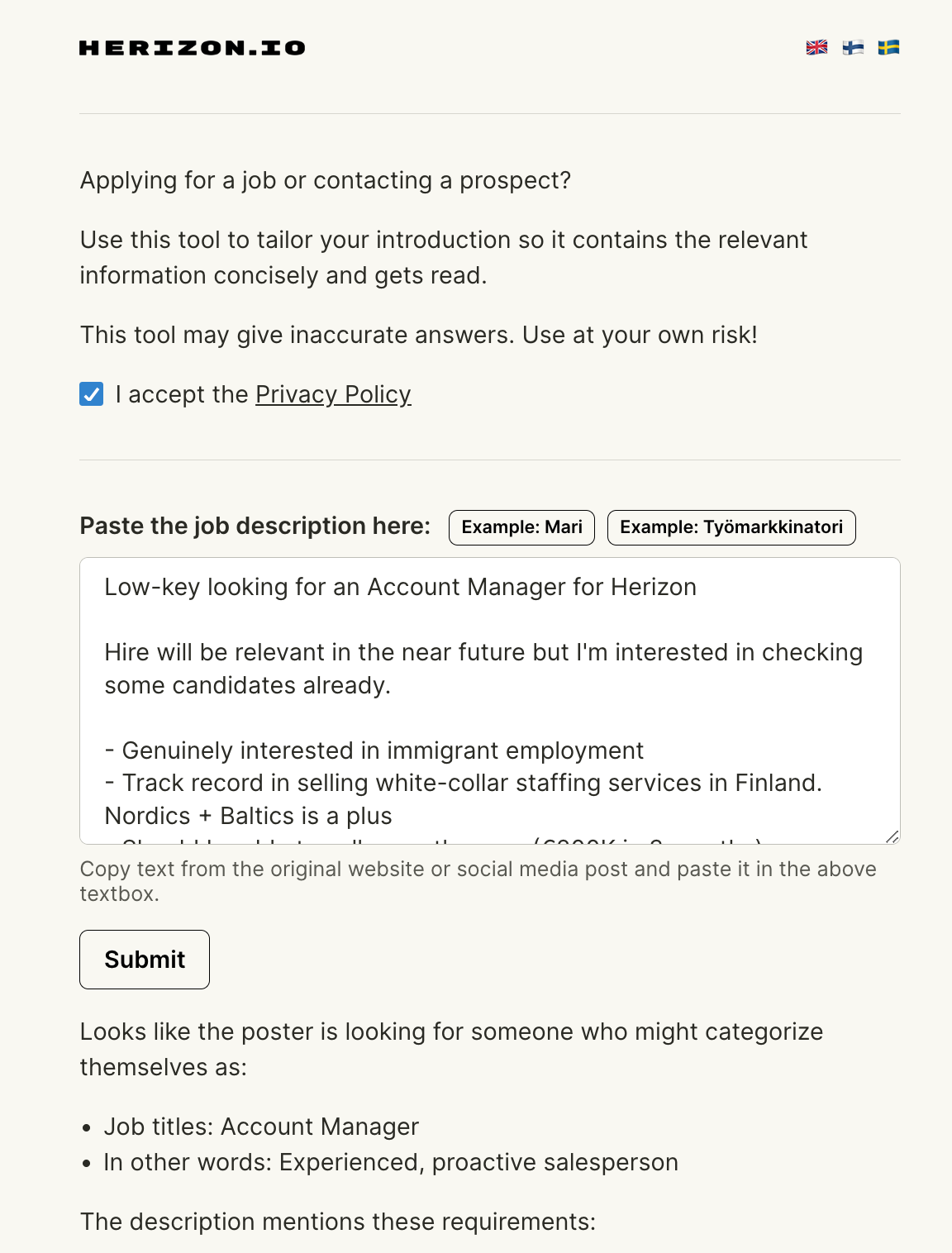 Ongelma: Erityisesti kansainvälisillä työnhakijoilla on usein haasteita kuvailla osaamistaan relevantilla tavalla herättääkseen mielenkiinnon ja päästäkseen haastatteluun. Yksittäisten työhakemusten arviointi ja parantelu on tässä avustaville henkilöille aikaavievää.