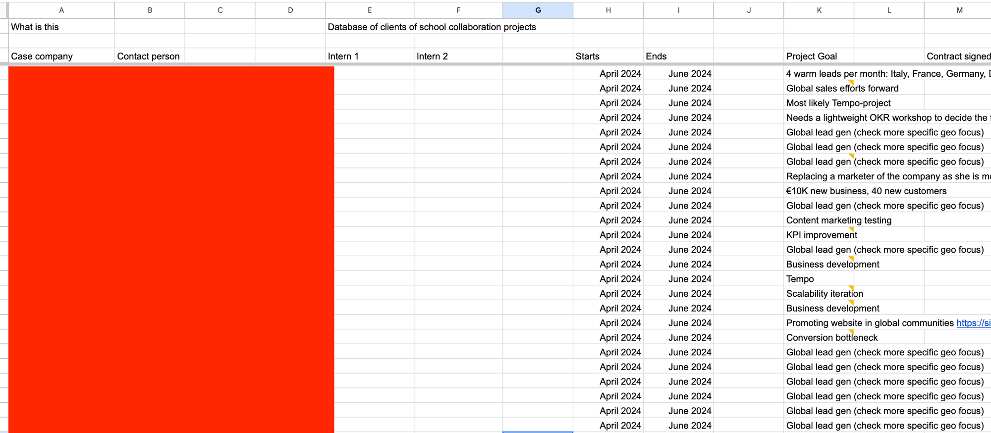 After posting, the response was overwhelmingly positive. I engaged in brief discussions with interested parties, answering their questions and gathering their contact information. To keep everything organized, I used a Google Spreadsheet where I logged their emails and goals for the internship.