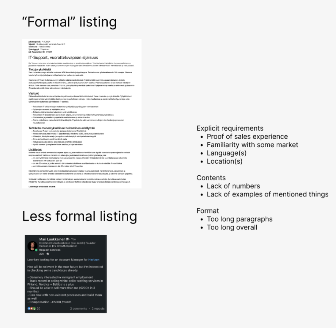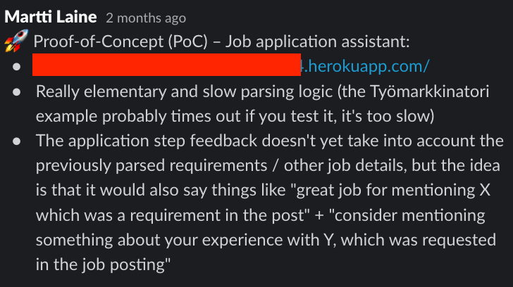 Job Application Assistant was discussed internally in April after I posted a post on LinkedIn that we're searching for an Account Manager. I didn't receive any relevant applications, so we decided to build a lightweight MVP for 2 usual use cases: a formal job ad and a less formal job ad.